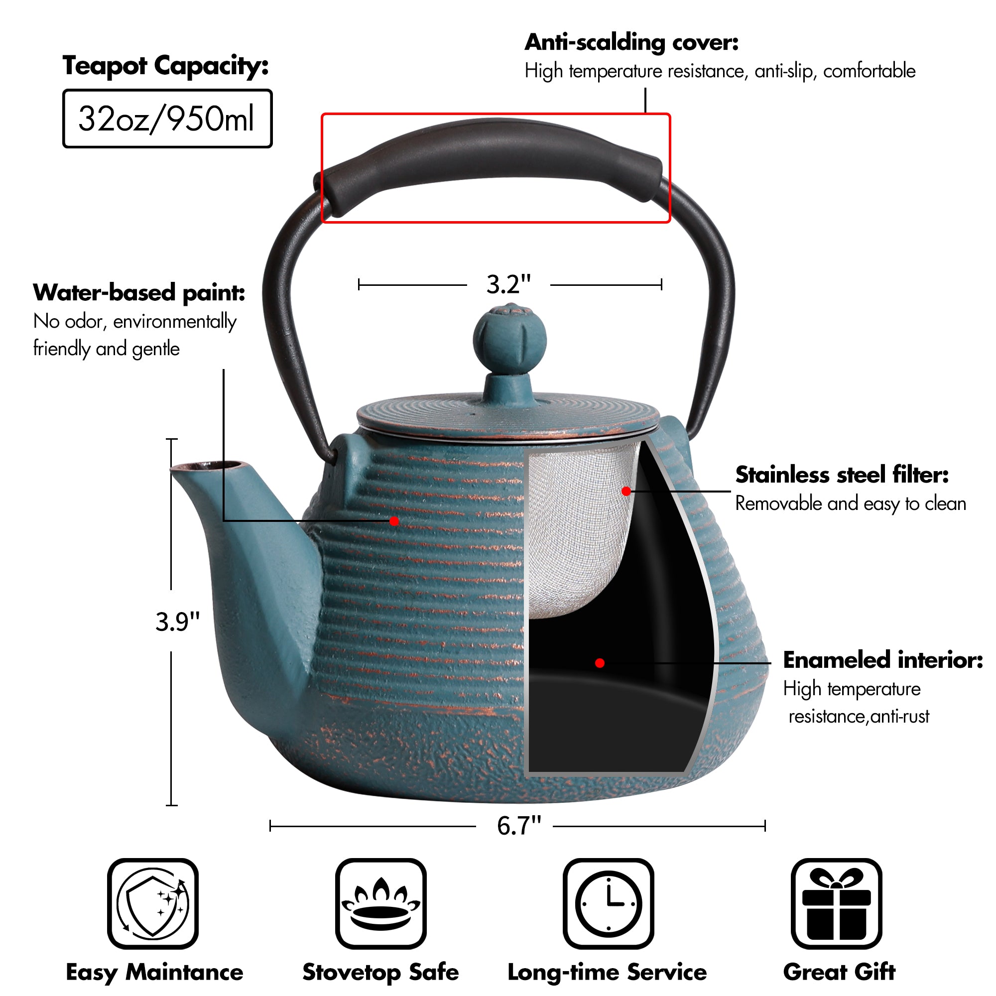 Cast Iron Material: Crafted from high-quality Australian iron ore, each teapot is hand-finished to create its unique surface texture. The specially selected premium Australian iron ensures better heat absorption, faster heating, and superior heat retention. This exquisite cast iron teapot blends traditional craftsmanship with modern aesthetics.